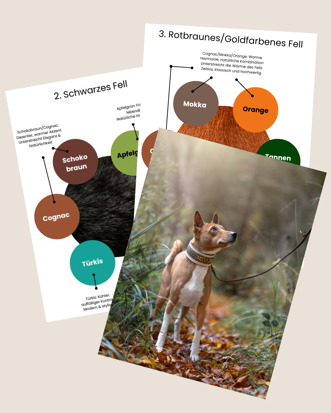 Entdecke die perfekten Farben für Halsband, Leine & Accessoires deines Hundes! Unser kostenloser Farbguide hilft dir, die ideale Kombination passend zur Fellfarbe zu finden.
